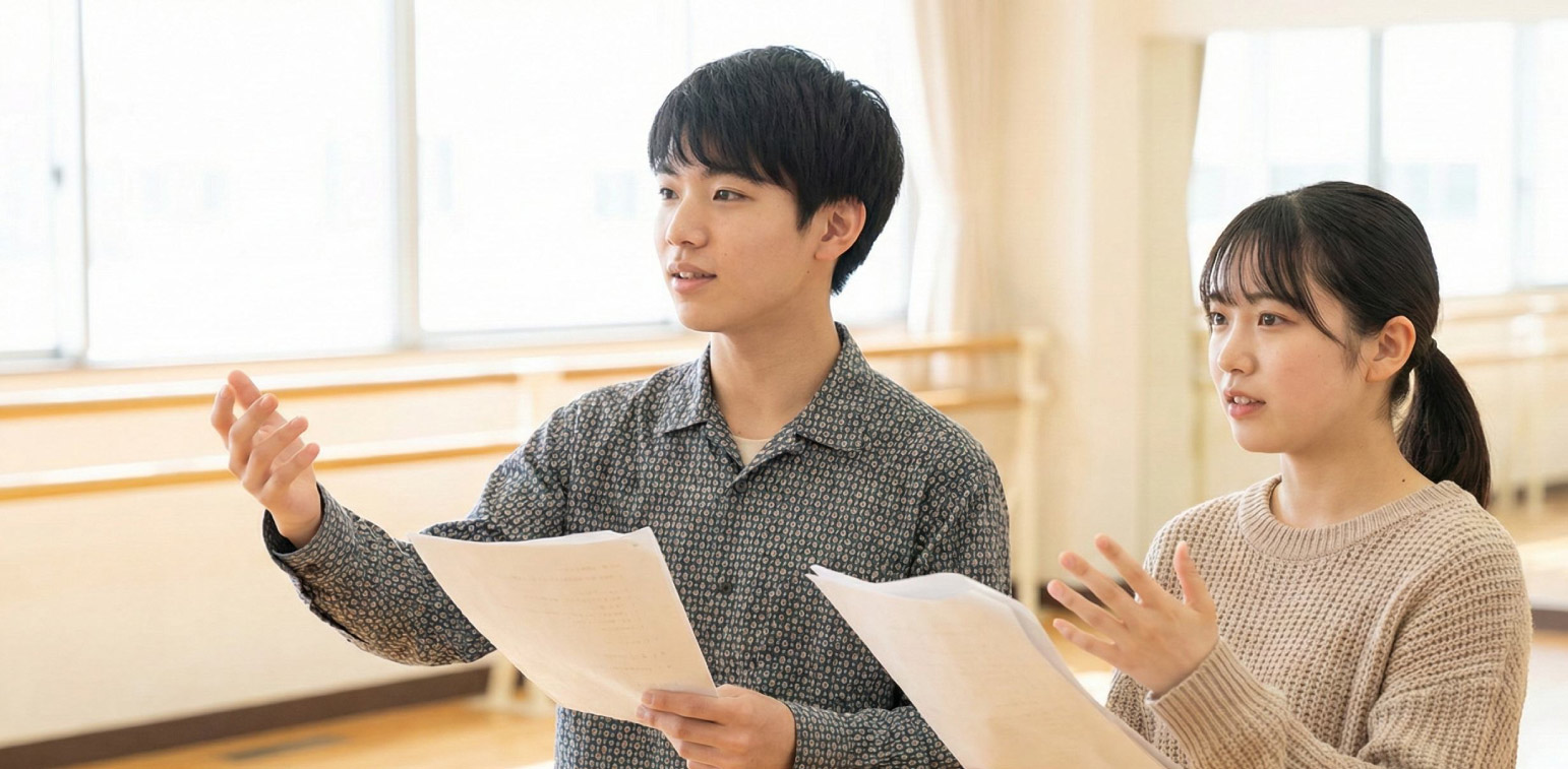 実際の台本を使い、役の気持ちを考える読解力や、相手との距離感・掛け合いを実践的に学びます。